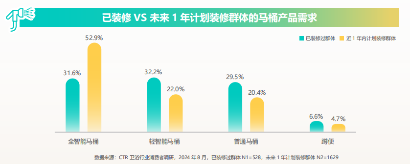 巨量引擎发布的《2024卫浴行业白皮书》调查显示,已经装修过的用户群体选择全智能马桶和轻智能马桶的比例分别占到了三分之一,而那些一年内计划装修的人里,则有超过一半打算选购全智能马桶。